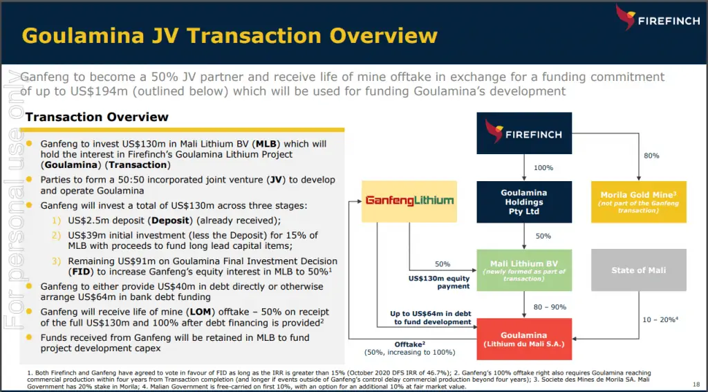Both Gangfeng and FFX has signed binding agreements to facilitating joint venture transactions. Ganfeng is currently seeking regulatory approvals from Chinese authorities, which are expected to take three months. Once approval is received around December 2021 the first instalment of US$39 Million in equity investment is due.
