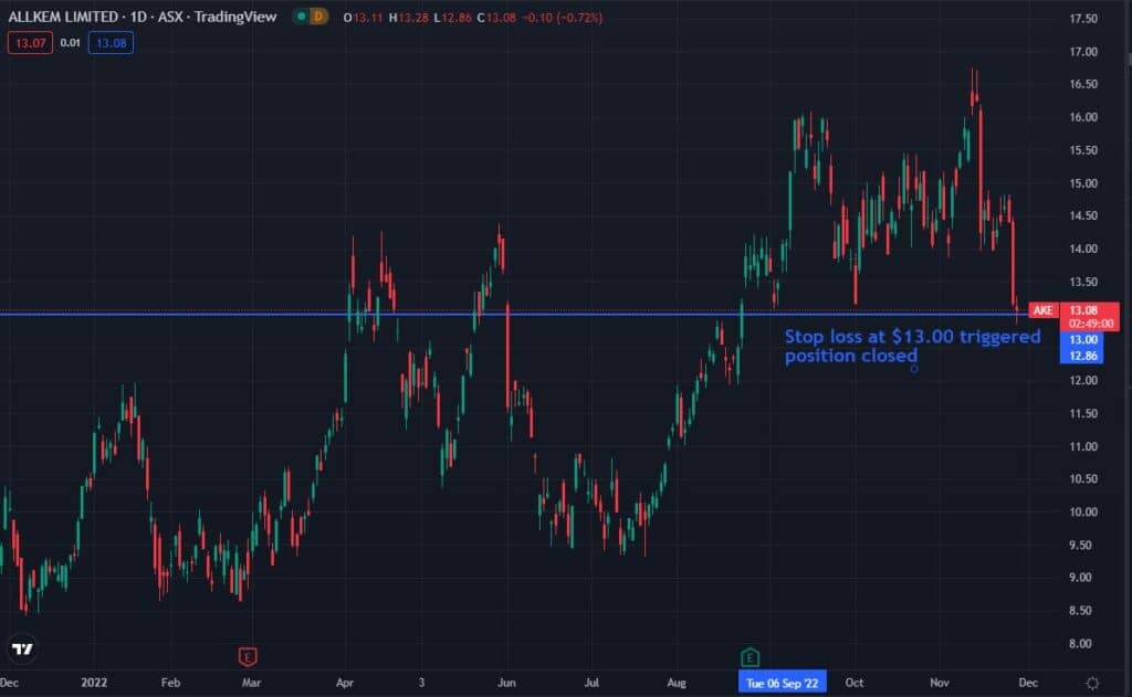 The AKE share price was as high as $16.50 on the 14th of November and the position was in profit by 11%. The fall in the AKE share price to the stop loss level looks to be related to market concerns that recent price increases for Lithium are unsustainable and China lockdowns.