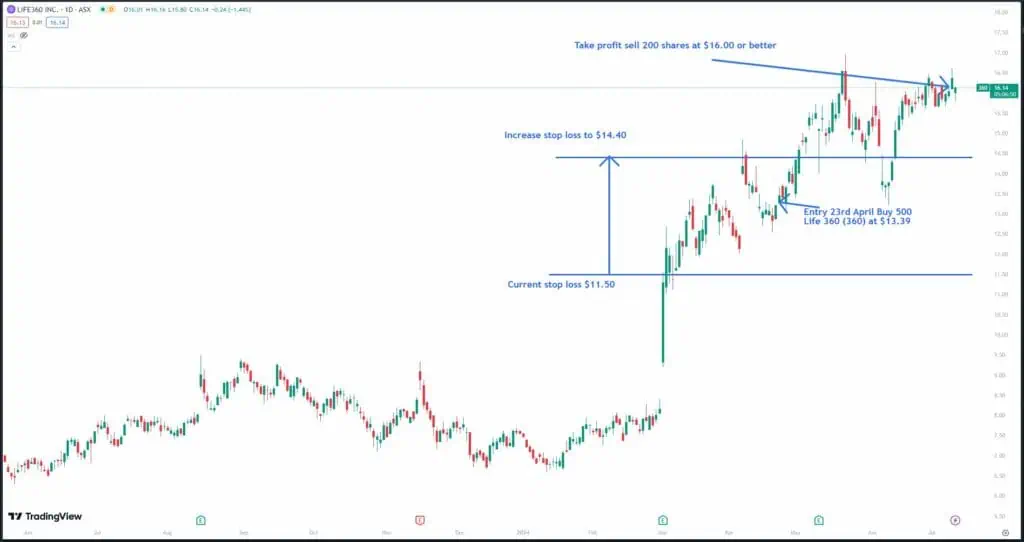 The share price of life 360 (360) has moved higher by 20% since our initial purchase on the 23rd of April 2024 and is currently trading around the $16.00 level.