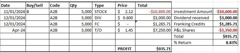 Buy A2B shares at the current market price of $2.12. Ex-dividend $0.60 with $0.257 franking on 12th Jan with a payment date of 30th Jan. The remaining capital amount of the takeover, $1.45, is paid in mid-April. The table below better explains the outcome. We can make an 8.83% return on funds invested in about three months if the company takeover is finalised as per the timetable published by the company.