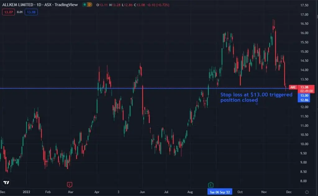 In trading, over the last several sessions the Allkem (AKE) share price has fallen sharply, and the position reached our stop loss level of $13.00 in early trading this morning.