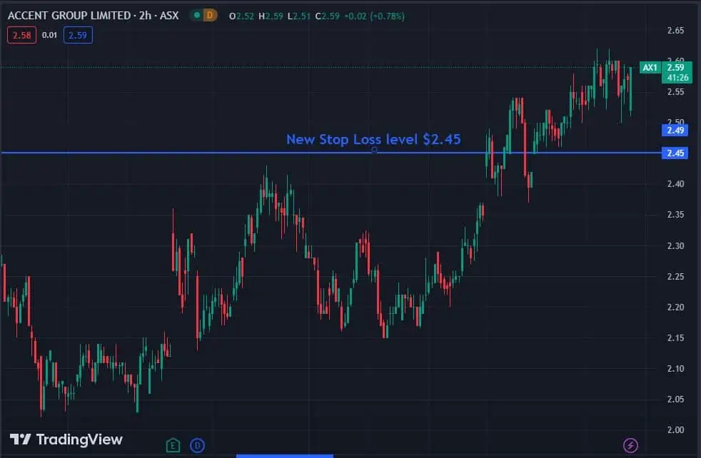Given the recent move higher in the Accent Group (AX1) share price, it is prudent given current market conditions to increase the stop loss level.