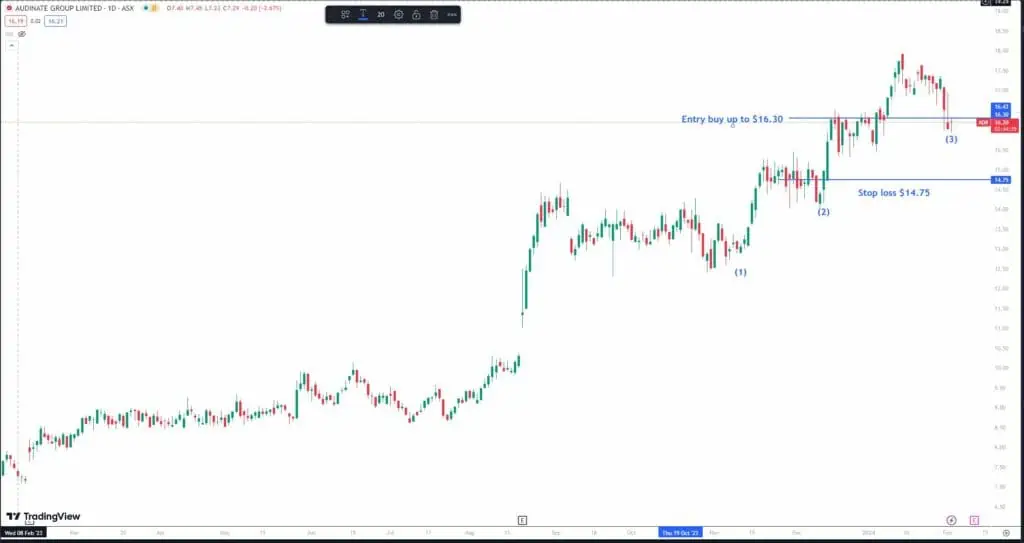 We can see a simple trendline has developed and it’s clearly noticeable each time price has touched the trendline, price has bounced off and continued the uptrend. So each time the stock has touched the trendline (see 1, 2 & 3), the stock is signalling an opportunity exists for a potential entry point at these key demand areas.