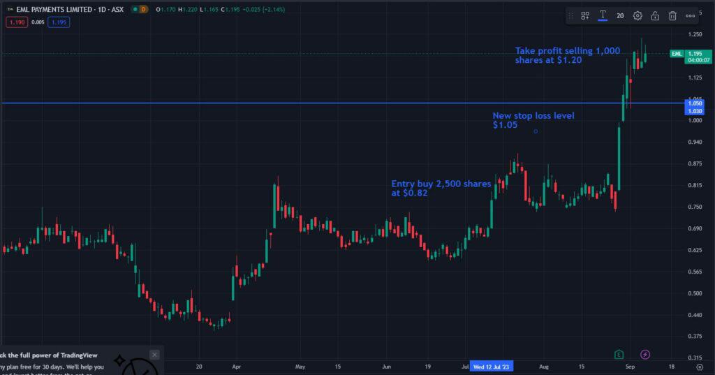 Given the sharp rise in the share price, we look to sell part of the position to lock in profit and increase the stop loss on the remaining shares. We are going to let out profits run on part of the position in the hope of making an outsized profit on the remaining shares.