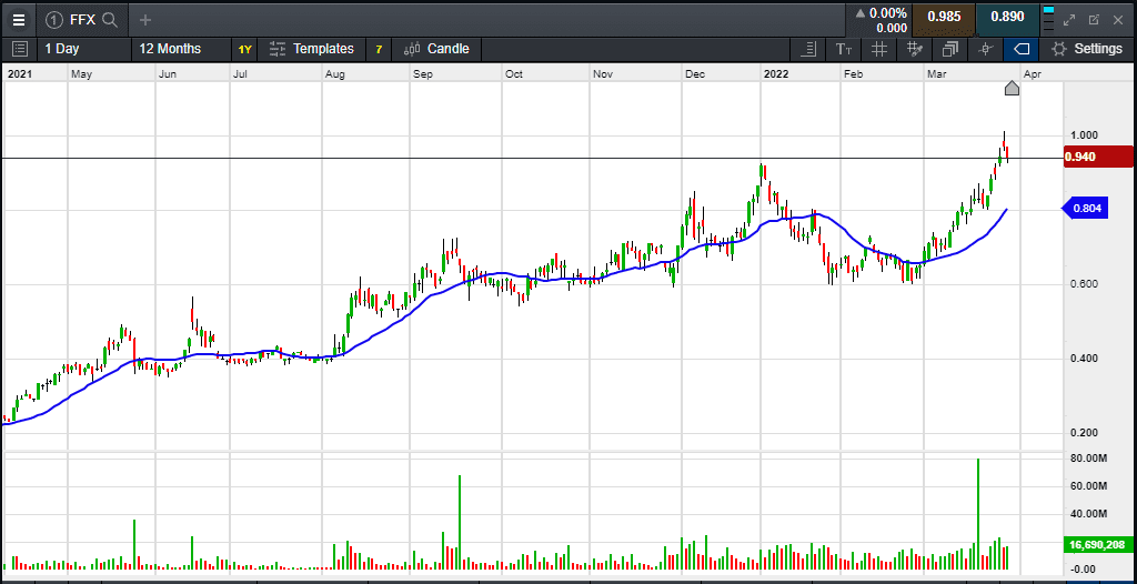 The High Conviction portfolio currently has 15,000 shares in FFX. We will look to sell down 7,500 shares (50% of current position) at $0.90 or better to lock in profits.
