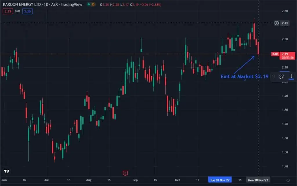 In the energy sector, stocks in the industry group oil and gas have had mixed results recently given the oil price as come off. Our initial position was well timed entering at the low end of the trading range, but it now looks as though KAR has met some stiff resistance at the $2.42 level. Given this unsuccessful attempt at breaching resistance, we are happy to exit with a small profit and allocate resources elsewhere.