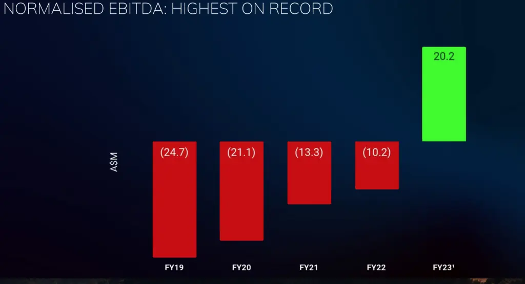 As the graph below shows, over the last 5 years, MP1 has increased it’s normalised EBITDA, from churning out negative $24.7 million in FY19 to turning positive (with the green line) of $20.2 million in FY23.