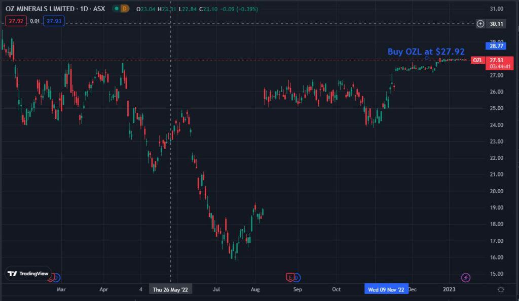 Buy 2,000 OZL at $27.92. No stop loss or profit target