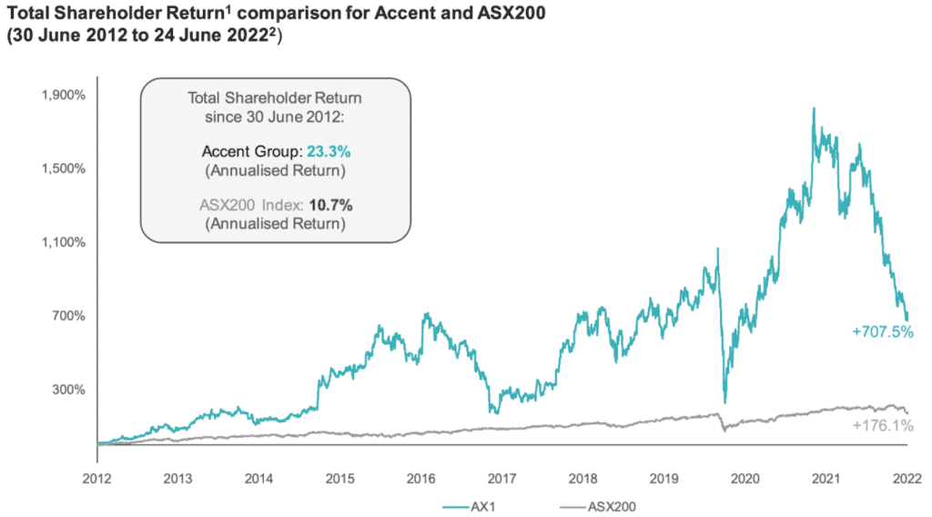 Turning to the graph below, in spite of a disrupted FY ’22 year, and since 2012, AX1 has delivered a 23.3% per annum compounding annualized return, outstripping that of the ASX 200 at 10.7% per annum compounding annualized return. This is evidence AX1 has delivered long-term shareholder growth over the last 10 years – which is more than double that of the ASX 200.