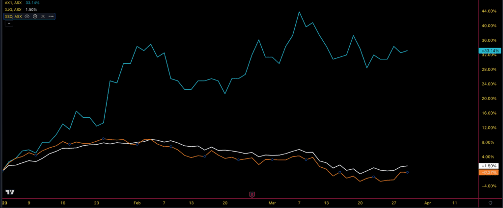 Not surprisingly, year to date AX1 continues to show strength when compared to the ASX 200 (white) and the Small Ordinaries Index (orange).