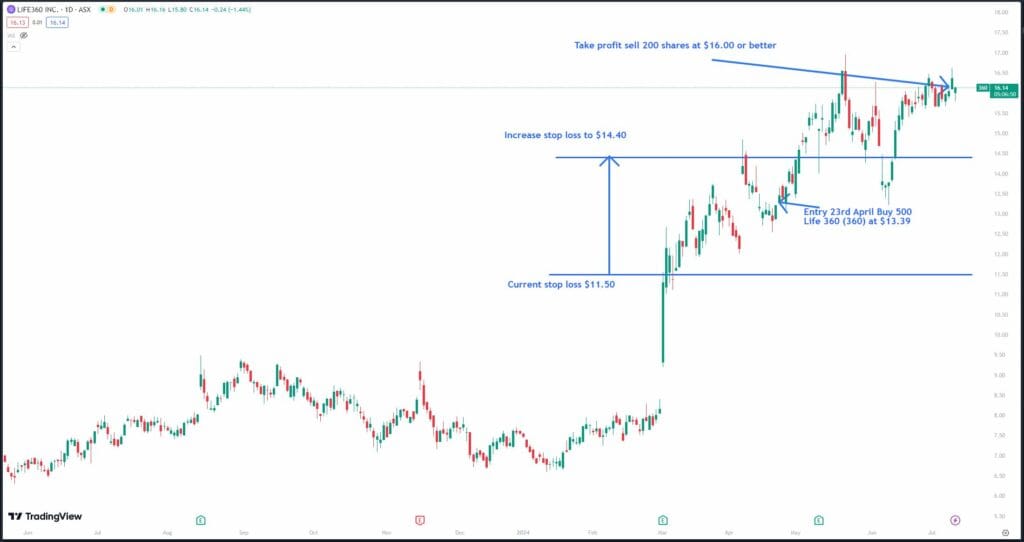 The share price of life 360 (360) has moved higher by 20% since our initial purchase on the 23rd of April 2024 and is currently trading around the $16.00 level.