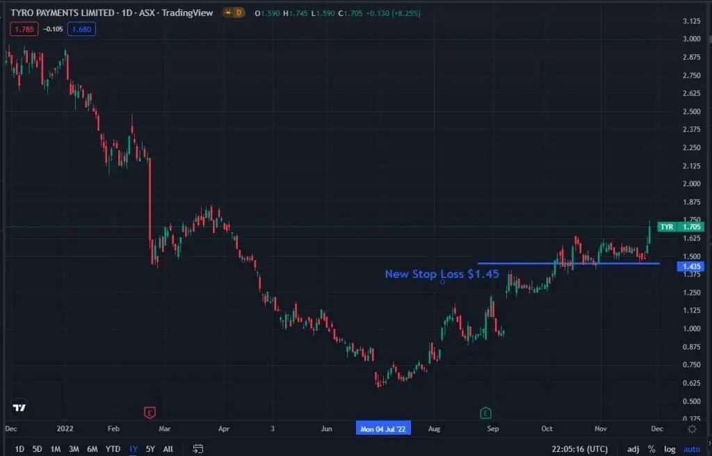 The share price of Tyro (TYR) has kept increasing so it is time to increase the stop loss level once again on the open position.