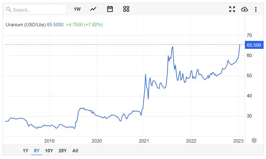 The price of uranium has increasing from $56.75 USD/Lbs on the 11th of August 2023 to $65.50 USD/Lbs today. Based on the price today that is a five year high for uranium.