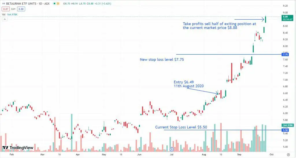 With the increase in the price of Betashares Global Uranium ETF (URNM) to $8.88 today it is time to lock in profits on part of the position and increase the stop lo
